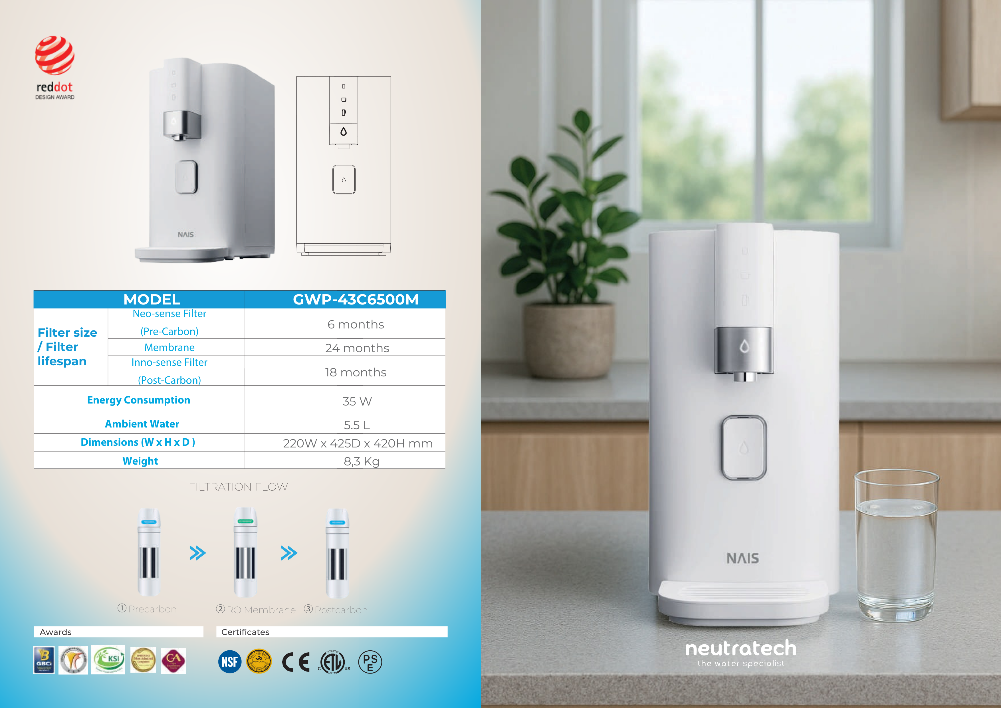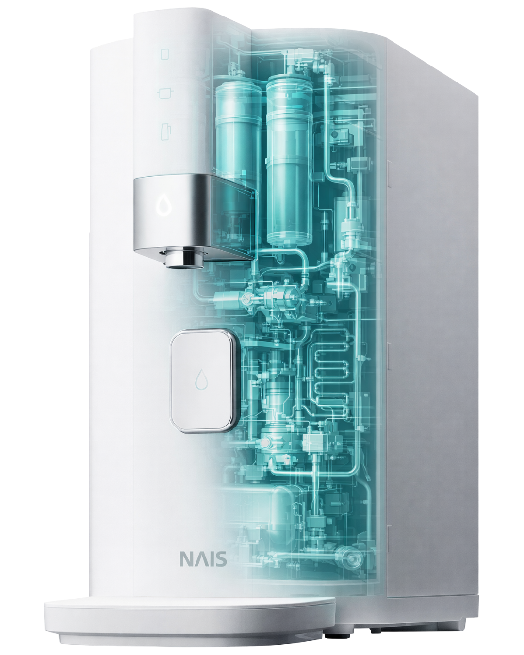 Neutratech Nais Tidy system delivers instant room-temperature purified water, combining an advanced RO filtration technology with UV light sterilization for everyday convenience.